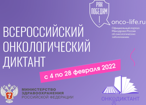 Всероссийский онкологический диктант - просветительский проект Министерства здравоохранения Российской Федерации, направленный на повышение информированности об онкологических заболеваниях. Диктант проводится в формате теста, на прохождение которого отводится 1 час, по итогам каждый участник получит сертификат и рекомендации от экспертов. Пройти онкологический диктант может любой желающий: от школьников до пенсионеров, вне зависимости от уровня образования.