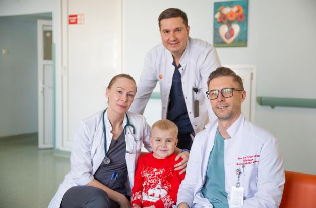 На фото: пациент перед выпиской с мамой и своими врачами - кардиохирургом Виталием Шабановым, анестезиологом-реаниматологом Владимиром Бобошко, кардиологом Дарьей Погребницкой;