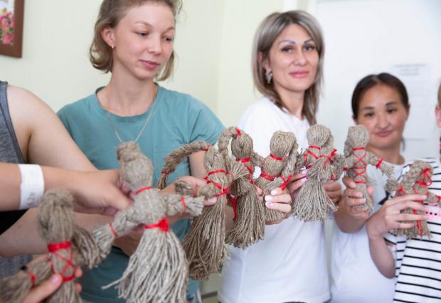 Специалист по социальной работе из отделения реабилитации пациентов с соматическими заболеваниями Инна Владимировна Какаулина научила всех мастерить куклу-оберег из льняного шпагата.